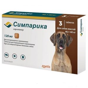 СИМПАРИКА Таблетка 120 мг для защиты от блох и клещей для собак весом 40,1-60 кг, за 1 таблетку.