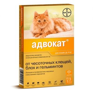 АДВОКАТ Капли на холку от внутренних и внешних паразитов для кошек весом до 4 кг, цена за 1 пипету