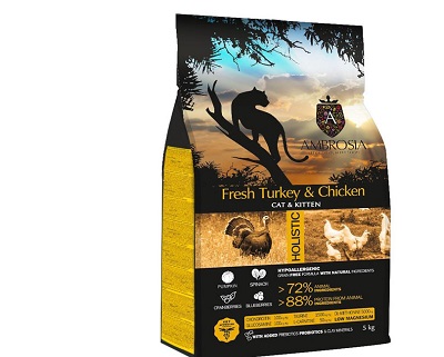 Ambrosia Cat&Kitten (Индейка, курица) — сочетает в себе два источника птичьего белка, получаемого из свежего филе индейки, а также дегидратированной курицы и отборных фруктов и овощей. Включает пребиотики и пробиотики для улучшения пищеварения и иммунной системы, хондроитин и глюкозамин для защиты суставов, а также таурин и L-карнитин для развития мозга, сердечно-сосудистой и мышечной систем. Рецепт корма для всех жизненных этапов содержит все необходимые ингредиенты для правильного роста котят и при этом не является слишком калорийным для взрослых кошек.