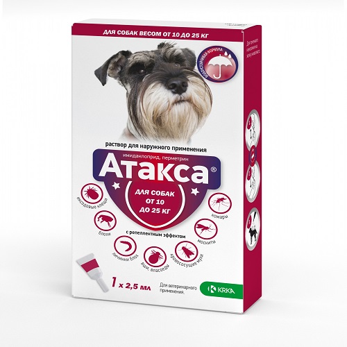 Препарат Атакса® эффективен против имагинальных и преимагинальных и личиночных фаз развития блох (Ctenocephalides canis, Ctenocephalides felis), власоедов (Trichodectes canis), иксодовых клещей (Rhipicephalus sanguineus и Ixodesricinus, Dermacentor reticulatus), паразитирующих на собаках, обеспечивает защиту животных от нападения комаров (Aedes aegypti, Culex pipiens), мух (Stomoxys calcitrans) и москитов (Phlebotomus papatasi, Phlebotomus perniciosus).