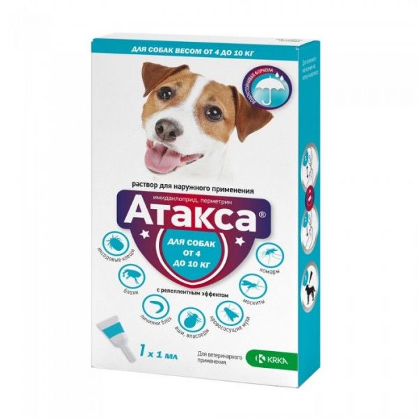 Препарат Атакса® эффективен против имагинальных и преимагинальных и личиночных фаз развития блох (Ctenocephalides canis, Ctenocephalides felis), власоедов (Trichodectes canis), иксодовых клещей (Rhipicephalus sanguineus и Ixodesricinus, Dermacentor reticulatus), паразитирующих на собаках, обеспечивает защиту животных от нападения комаров (Aedes aegypti, Culex pipiens), мух (Stomoxys calcitrans) и москитов (Phlebotomus papatasi, Phlebotomus perniciosus).