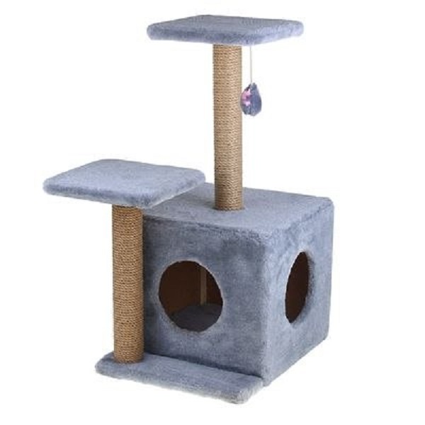 Столбик, обкрученный джутом. и 2 просторные платформы с игрушкой на веревочке. Уютный домик с двумя входами , обтянутый плюшем. Конструкция разборная.