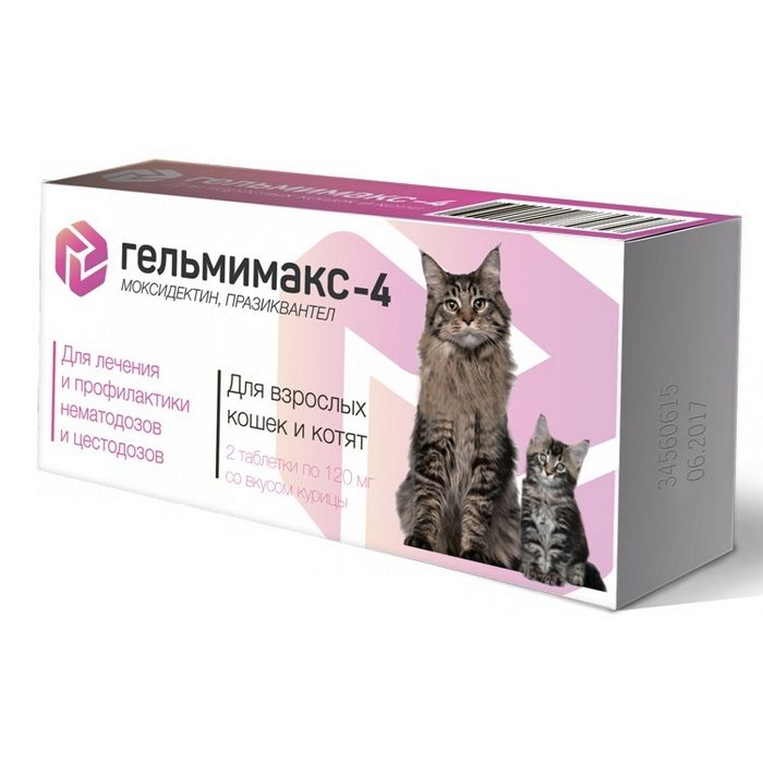 Гельмимакс-4 «для взрослых кошек и котят, щенков и взрослых собак мелких пород»: празиквантел — 20 мг/табл., моксидектин — 1 мг/табл.