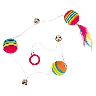Игрушка “TRIXIE” для кошки “Радужные шарики” на веревке. Диаметр: 3,5/80 см. На резинке. 3 шарика. 3 колокольчика, перья.