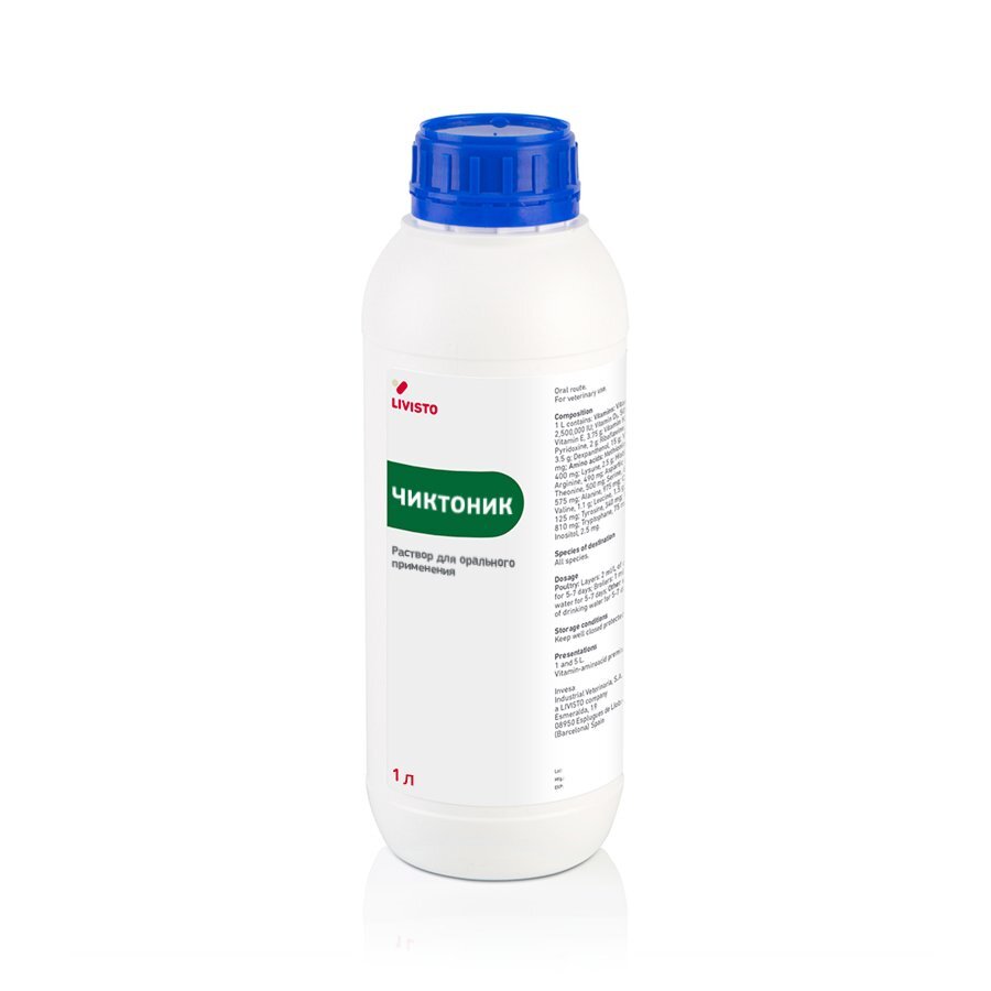1. Чиктоник (CHICKTONIC) — кормовая добавка, предназначенная для обогащения и балансирования рационов сельскохозяйственных животных, в том числе птиц, по витаминам и аминокислотам.