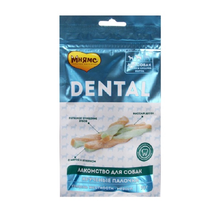 Мнямс DENTAL “Крученые палочки” с ягненком и мятой – вкусное и полезное лакомство для взрослых собак и щенков старше 3-х месяцев. Обладают высокой вкусовой привлекательностью, предотвращают появление зубного налета, обеспечивают деликатный массаж десен, освежают дыхание, защищают от появления запаха из пасти и снижают риск развития заболеваний полости рта.