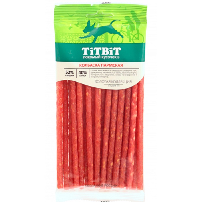 Золотая коллекция – это линейка лучших лакомств TITBIT, разработанных при участии владельцев домашних животных и их питомцев. Колбаса «Пармская» приготовлена из говядины и филе курицы и дополнена щепоткой мускатного ореха, придающего изысканность нежному вкусу.