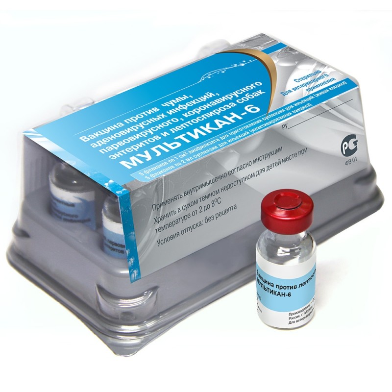 Вакцина Мультикан-6 предназначена для профилактики чумы, аденовирусных инфекций, парвовирусного, коронавирусного энтеритов и лептоспироза собак.