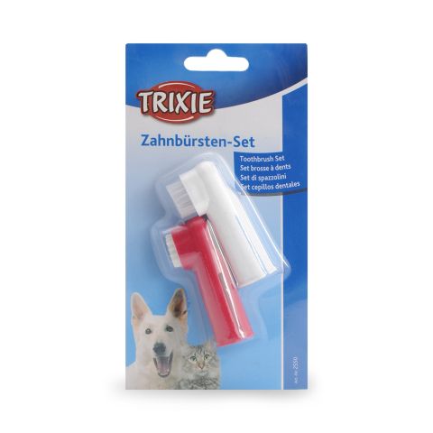 Набор “Trixie” создан для чистки зубов собак. В набор входят 2 щетки, которые одеваются на палец – одна массажная, вторая зубная.