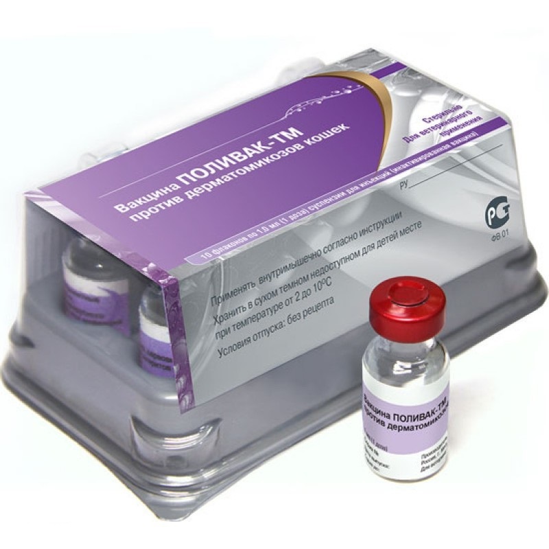 Вакцина ПОЛИВАК-ТМ – ассоциированная инактивированная вакцина против дерматомикозов включает грибы из рода Trichophyton (стригущий лишай) и Microsporum, является безопасным и высокоэффективным средством специфической профилактики и лечения микроспории и трихофитии у животных семейства кошачьих. По внешнему виду вакцина представляет собой однородную жидкость светло-коричневого цвета с тонким осадком на дне.