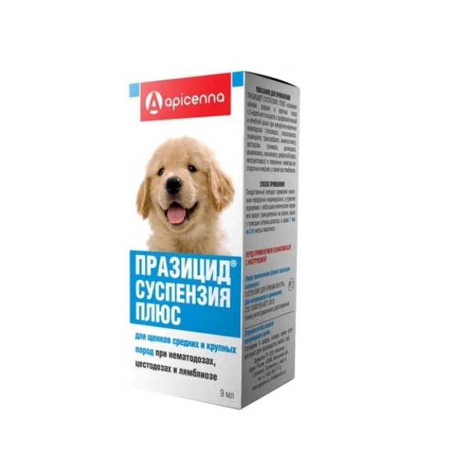 Празицид-суспензия Плюс для щенков средних и крупных пород и взрослых собак: пирантела памоат — 45 мг/мл, фебантел — 45 мг/мл, празиквантел — 15 мг/мл, вспомогательные вещества до 1 мл.
