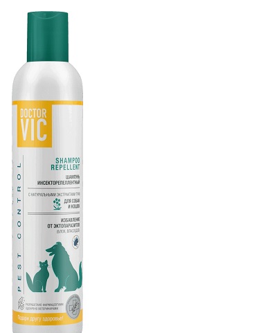 Doctor VIC (Доктор Вик) Шампунь применяется для избавления собак и кошек от эктопаризитов (блох, власоедов). Обладает репеллентным эффектом – отпугивает кровососущих насекомых. Применяется для очистки, увлажнения, укрепления, питания кожно-волосяного покрова животных с любым типом шерсти.
