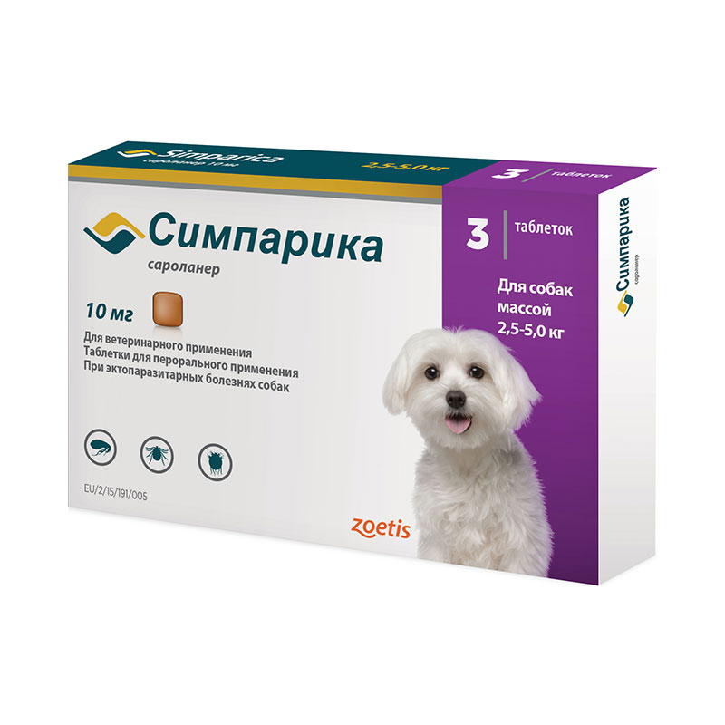Таблетка СИМПАРИКА от блох и клещей для собак от 2,5 до 5 кг, 1 таблетка, 10 мг
