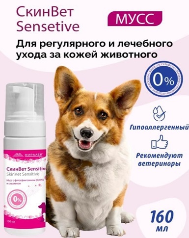 Мусс СкинВет Sensitive — гипоаллергенное смягчающее и увлажняющее средство для регулярного ухода за кожей собак и кошек (со скваленом и фитосфингозином 0,05%).