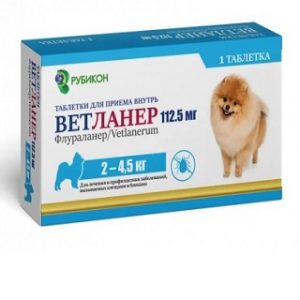 В 1,0 г препарата содержится 500 мг флураланера, а также вспомогательные вещества: лактозы моногидрат, дрожжи неактивные, целлюлоза микрокристаллическая, поливинилпирролидон, кросповидон, натрия лаурилсульфат, аспасвит Ц200, ароматическая добавка, кальция стеарат, тальк. В одной таблетке Ветланер 112,5 мг, Ветланер 250 мг, Ветланер 500 мг и Ветланер 1000 мг в качестве действующего вещества содержится соответственно 112,5 мг, 250 мг, 500 мг и 1000 мг флураланера. По внешнему виду Ветланер 112,5 мг представляет собой плоскоцилиндрические таблетки с риской или двояковыпуклые таблетки, Ветланер 250 мг, Ветланер 500 мг и Ветланер 1000 мг – двояковыпуклые таблетки светло-серого, светло-бежевого или светло-коричневого цвета, возможно наличие более темных или белых вкраплений. Препарат выпускают расфасованным по 1 или 3 таблетки: Ветланер 112,5 мг, Ветланер 250 мг и Ветланер 500 мг – в блистер, Ветланер 1000 мг – в полимерную банку;
