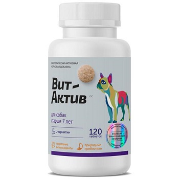 Вит-Актив – витаминно-минеральный комплекс для обеспечения физиологических потребностей собак старше 7 лет в витаминах, аминокислотах и минеральных веществах, обогащения рациона природными антиоксидантами и пребиотиками.